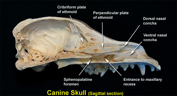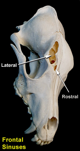 There are lateral, medial and rostral frontal sinuses. The medial and the rostral frontal sinuses are small and communicate with the nasal cavity. The medial frontal sinus may be absent. The lateral frontal sinus is the largest of the three. It is bounded laterally by the temporal line and medially by the median septum.