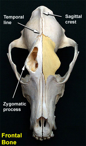 The frontal bones lie between the nasal bones and maxilla rostrally, and the parietal bones caudally. Ventrally the frontal bones articulate with sphenoid, palatine and lacrimal bones. They form the rostral part of the cranial cavity. The frontal bones participate in the formation of the dorsomedial part of the orbit, and envelope the ethmoid bone. The dorsal surface of the frontal bones is marked by the presence of two curved temporal lines, which extend from the zygomatic process rostrally to the sagittal crest caudally.