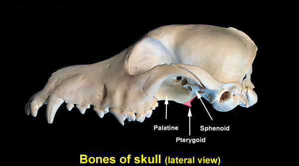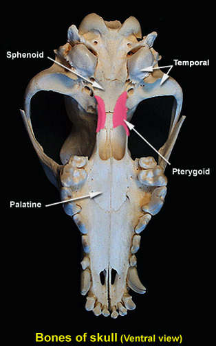 The pterygoid is small four-sided bone that articulates with the medial surface of the pterygoid process of the sphenoid bone.