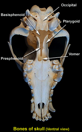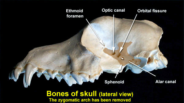 The sphenoid is formed of two bones, the rostral presphenoid and the caudal basisphenoid. The sphenoid bones form the rostral base of the braincase. Passing through the sphenoid bone are the optic canal, orbital fissure, and alar canal in the caudal part of the orbit. The optic canal for the passage of the optic nerve and the orbital fissure for the passage of oculomotor, trochlear, abducent, and ophthalmic nerves.