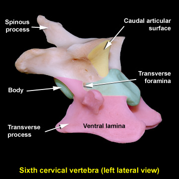 Sixth cervical vertebra: The C-6 vertebra possesses a higher spine than the third, fourth, or fifth, but its main peculiarity can be seen in the width and expanded nature of its transverse processes.