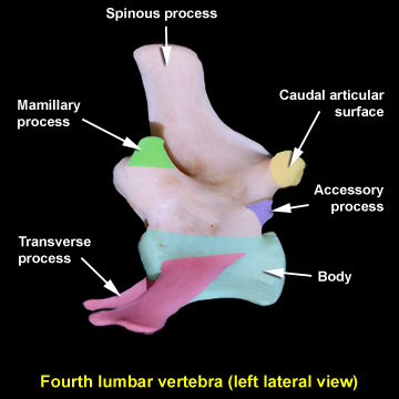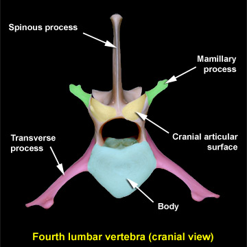 The lumbar vertebrae have longer bodies than the thoracic vertebrae. The transverse processes are directed cranially as well as ventrolaterally. Lying in a sagittal plane are they articular processes. The spinous processes are blunt and are to be found in the midlumbar region and have a slight cranial direction to them. The seventh lumbar vertebra is slightly shorter than the other lumbar vertebrae.