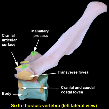 The body of the eleventh frequently lacks the caudal demifacets, and the twelfth and thirteenth thoracic vertebrae always have one complete fovea on each side. The fovea on the bodies of the vertebrae is for articulation with the heads of the ribs. On thoracic vertebrae 11, 12, and 13, the right and left facets face each other across the median plane and are located at the base of the mamillary process. The cranial articular facets, with the exception of those on the last three thoracic vertebrae, face forward and upward. The caudal facets articulate with the cranial ones of the vertebra behind, and are similar in shape, and face downward and backward on thoracic vertebrae 1 to 9.
