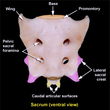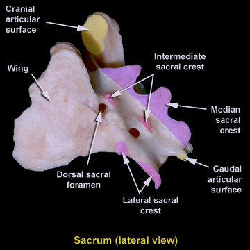 The sacrum is formed by a fusion of the bodies and processes of three vertebrae. It lies between the ilia and firmly articulates with them. The dorsal surface presents several markings that result form the fusion of the three sacral vertebrae. The median sacral crest represents the fusion of the three spinous processes. Found also on the dorsal surface are two pairs of dorsal sacral foramina, which transmit the dorsal branches of the first two sacral spinal nerves. Found on the pelvic, or ventral surface are two pairs of pelvic sacral foramina, which transmit the ventral branches of the first two sacral spinal nerves.
